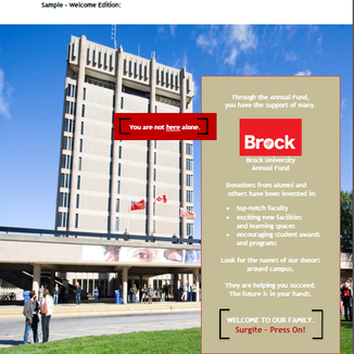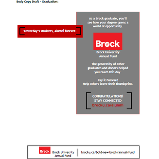 Project management and planning of an Undergraduate Awareness Campaign launching in the 2014-15 school year to create awareness of the Annual Fund, promote a culture of giving, encourage students, let students know Brock is beside them on their academic journey and show the support of Brock’s donors and alumni. I have designed a tri-fold communication strategy and campaign that can be implemented annually on a cost effective budget, targeting undergraduates at three critical times during the school year. I am also in charge of the development of all marketing and campaign materials such as body copy, design and graphic samples for both print and digital materials. I have been able to work within a strict budget to produce all campaign materials necessary to execute the campaign and developed a marketing timeline outlining tasks, launch dates and duration, costs for marketing materials, production and set up costs as well as an overview of total cost required for campaign production based on year. Apart from this, I have been in charge of development and planning of a Social Media campaign that will parallel the print campaign (including status and post body copy, creation of campaign graphics, post schedule and calendar) as well as the creation of a secondary Social Media campaign to juxtaposition the needs of students on campus to the investments made by donors and alumni - executed on four main social media handles surrounding Brock University and major campaign launch periods with already established followers. I have also completed CMS Level 1 training (Drupal -Brock University's content management system), through Brock University's Marketing Communications department